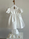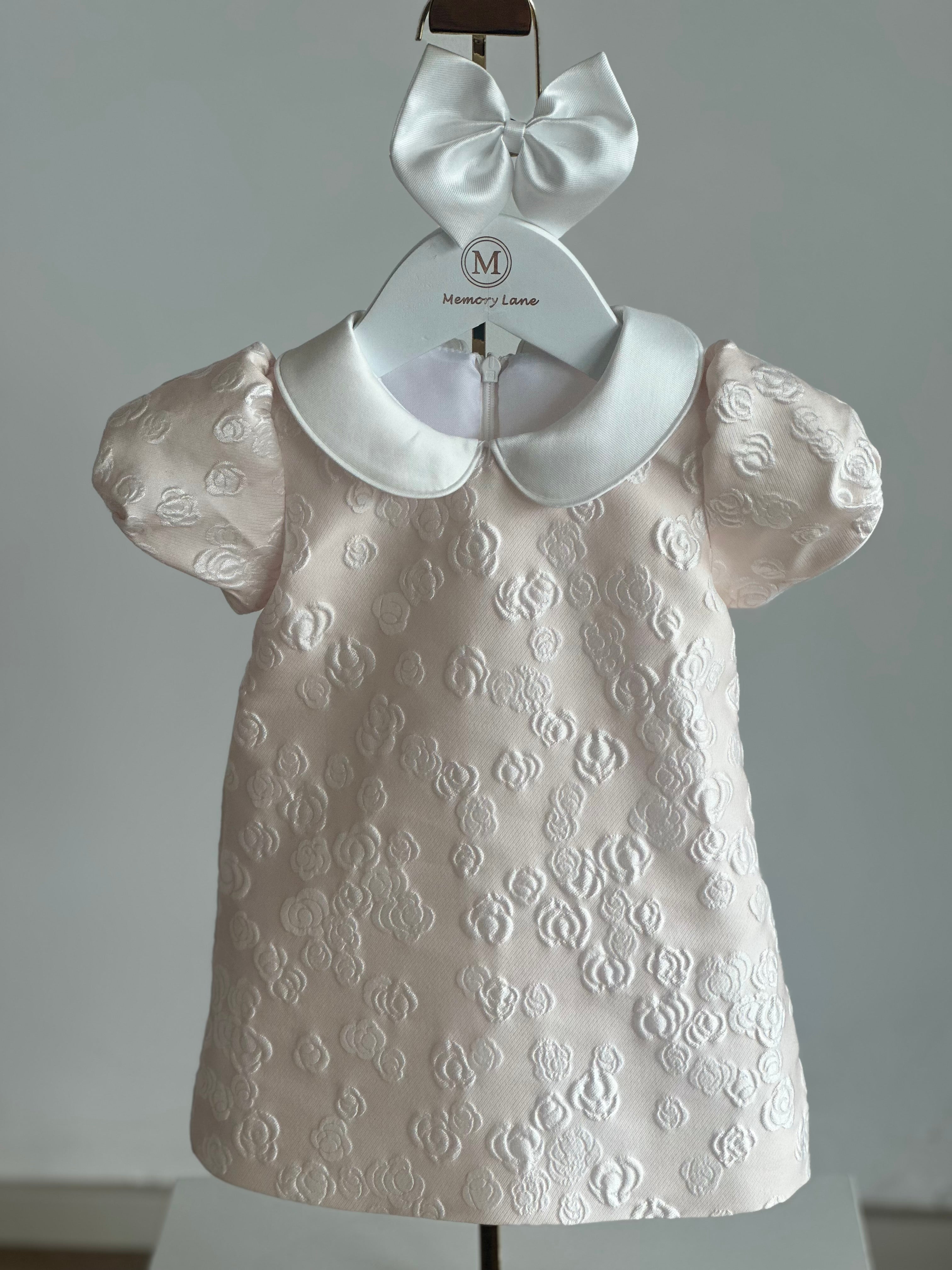 The Sibel Embossed Dress in a subtle pink hue features a charming Peter Pan neckline, crafted with care in Melbourne. Its delicate embossed texture adds refined elegance, perfect for special occasions. Coordinate look with matching hair clips and bloomers, available separately to complete the ensemble.